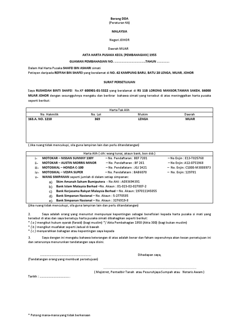 Borang Persetujuan Pembahagian Harta Pusaka Bagi Waris Dewasa Yg Tidak Hadir Perbicaraan