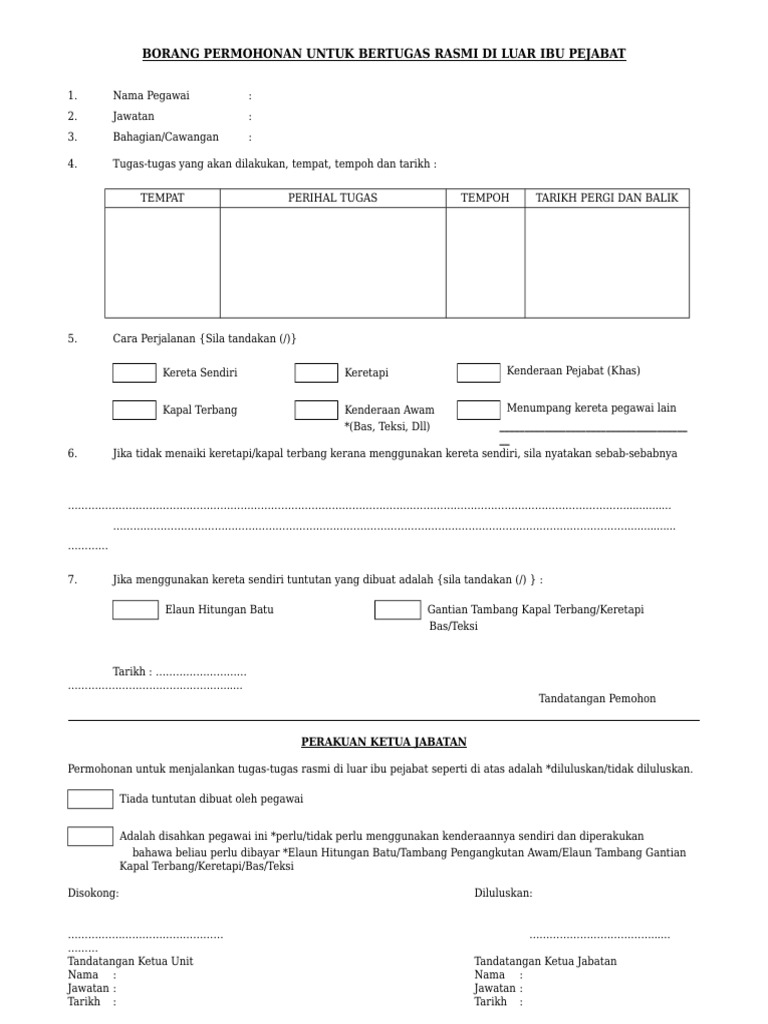 Tempat perihal tugas tempoh tarikh masa pergi balik. Janm negeri pahang 1. Cara perjalanan sila tandakan.